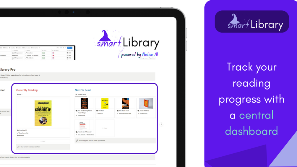 ✅Comprehensive book library template with ability to add covers. Central dashboard showing the current book and your priority next five!