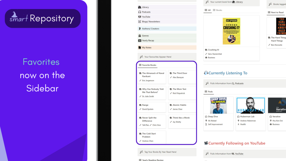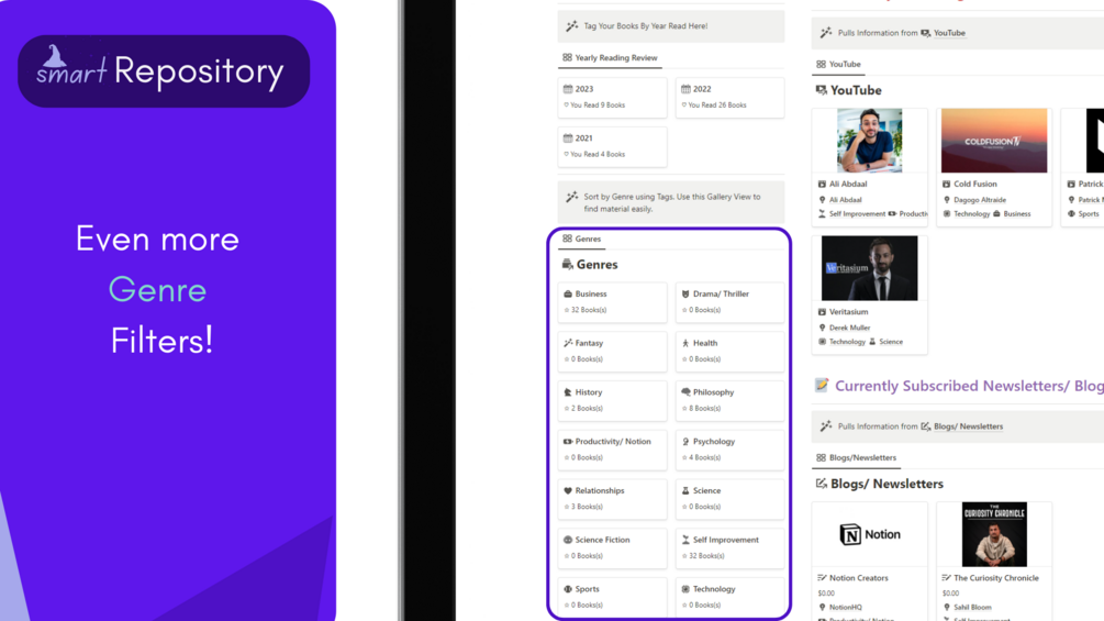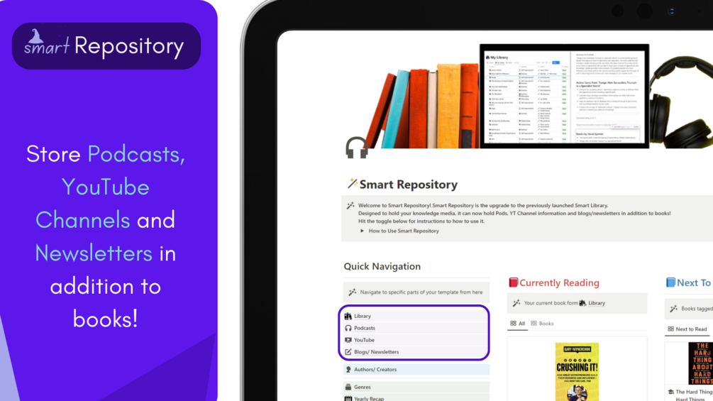 Smart Repository was designed to help store knowledge gained from books and other knowledge media- books, YT channels, podcast and blogs.
